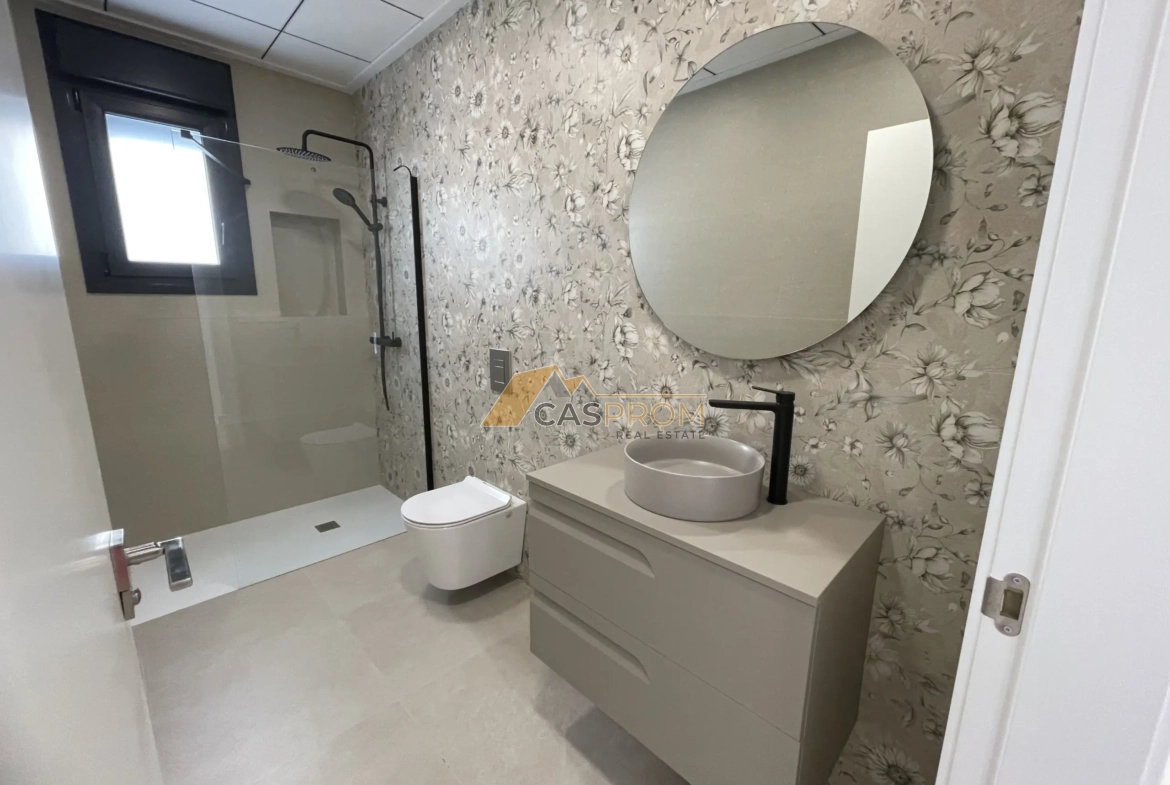 En la planta baja, se encuentra un amplio salón con comedor y una cocina abierta, creando una zona de estar luminosa y cómoda con acceso directo a la terraza, el jardín y la piscina. En esta planta también se encuentran un baño y un lavadero independiente. La primera planta cuenta con tres dormitorios, incluido el principal, y dos baños completos, lo que garantiza la comodidad y la privacidad de todos los residentes. La distribución se diseñó prestando especial atención a la ergonomía y a la luz natural. La cocina está amueblada y equipada con electrodomésticos. La propiedad cuenta con iluminación interior y exterior, así como aire acondicionado por zonas, lo que garantiza el confort térmico durante todo el año. La zona exterior incluye una piscina privada de 6 x 3 m, terrazas y jardín.