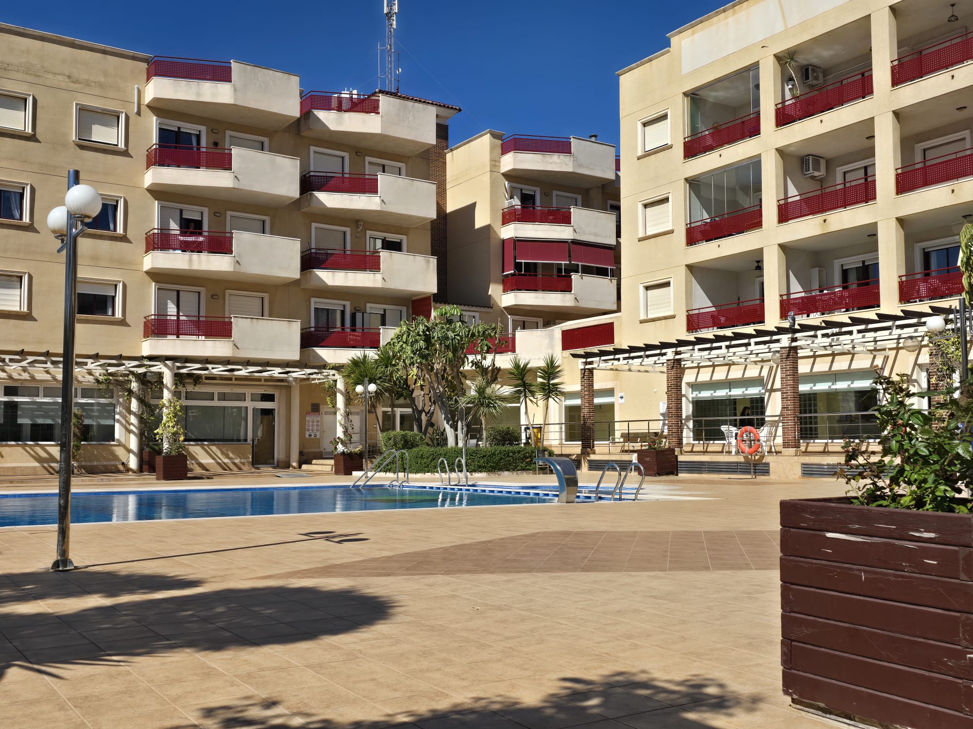 The development boasts a communal swimming pool, and a garage parking space is included in the price.