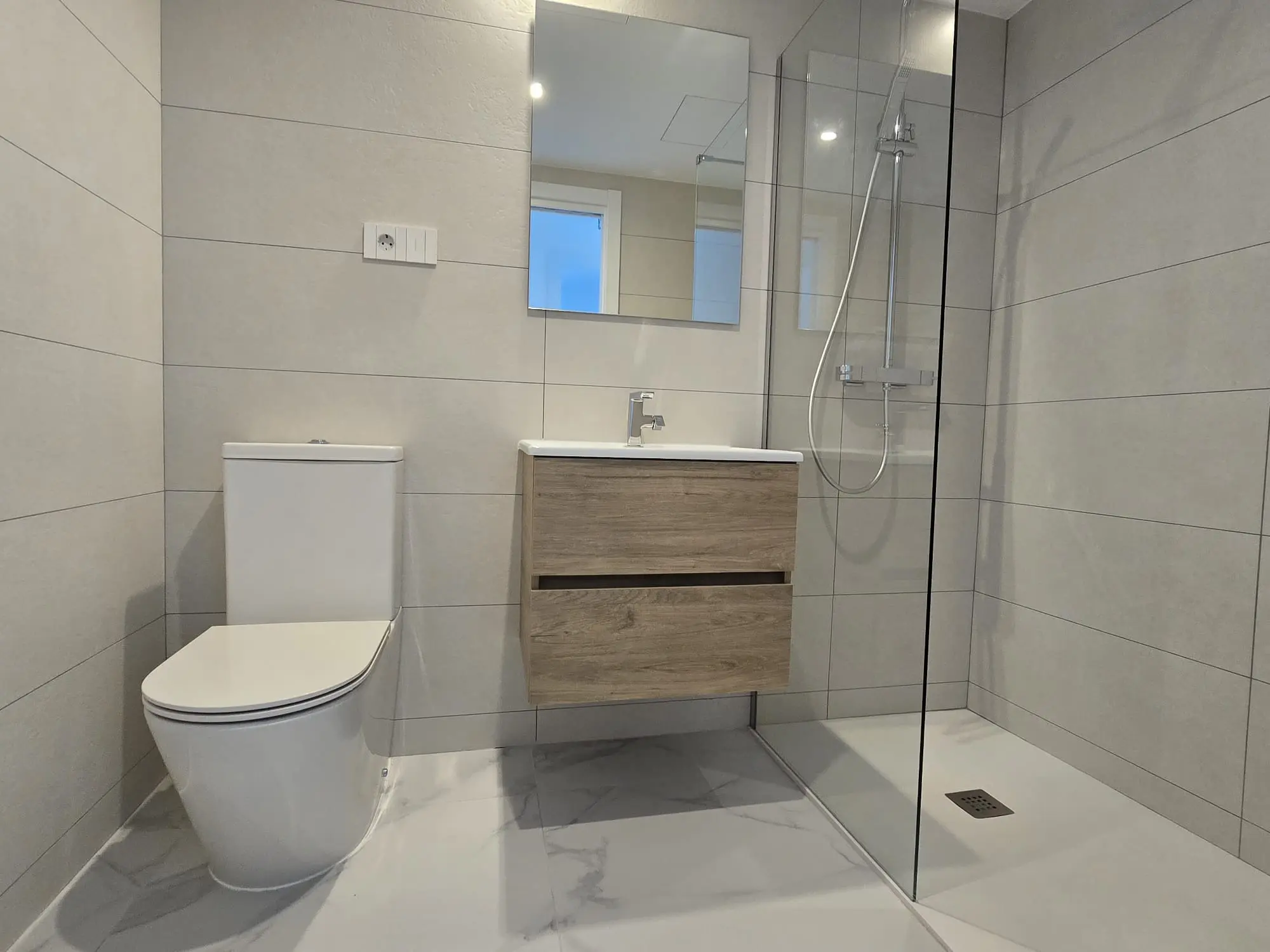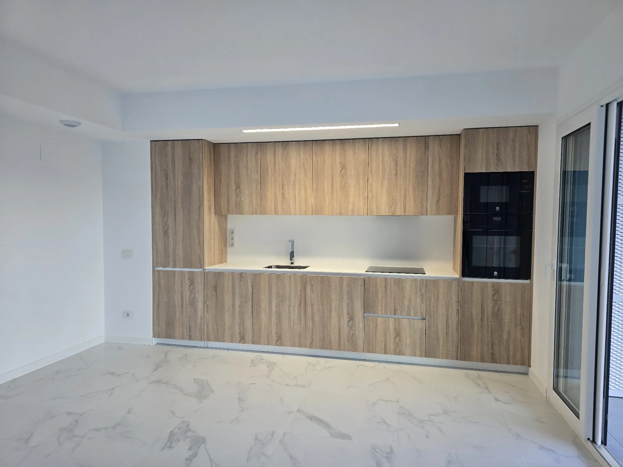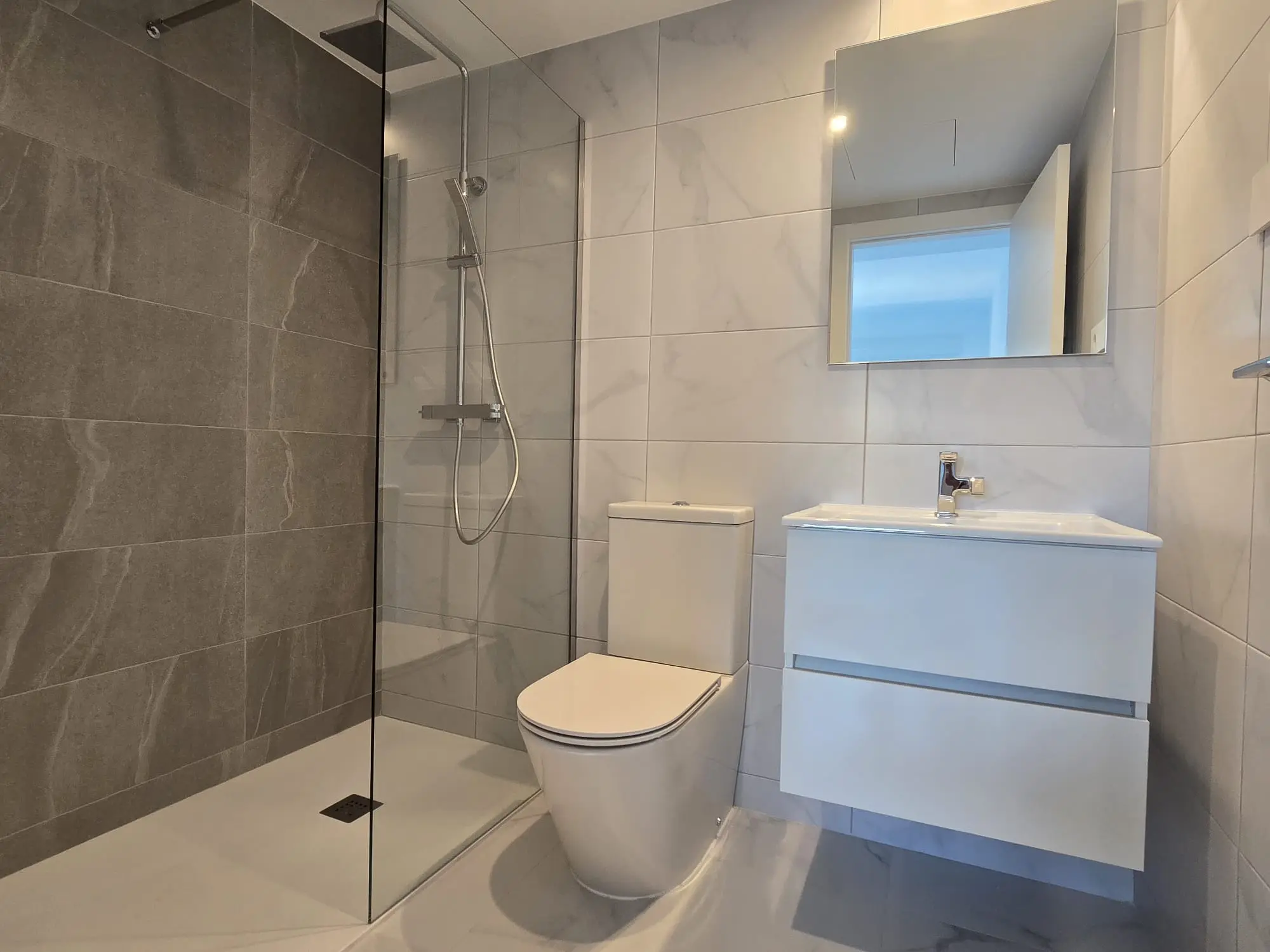 La cocina está totalmente equipada con electrodomésticos de alta calidad, incluyendo vitrocerámica, horno, microondas, frigorífico con congelador y lavavajillas. Los baños presentan un elegante acabado y cuentan con modernas duchas, grifería de diseño, espejos iluminados y detalles cuidadosamente seleccionados. El apartamento cuenta con dos cómodas habitaciones con armarios empotrados, lo que garantiza un uso práctico del espacio. Además, incluye una plaza de aparcamiento privada y un trastero. La vivienda está equipada con aire acondicionado central, calefacción por suelo radiante y persianas eléctricas en las habitaciones, lo que mejora considerablemente el confort diario.
