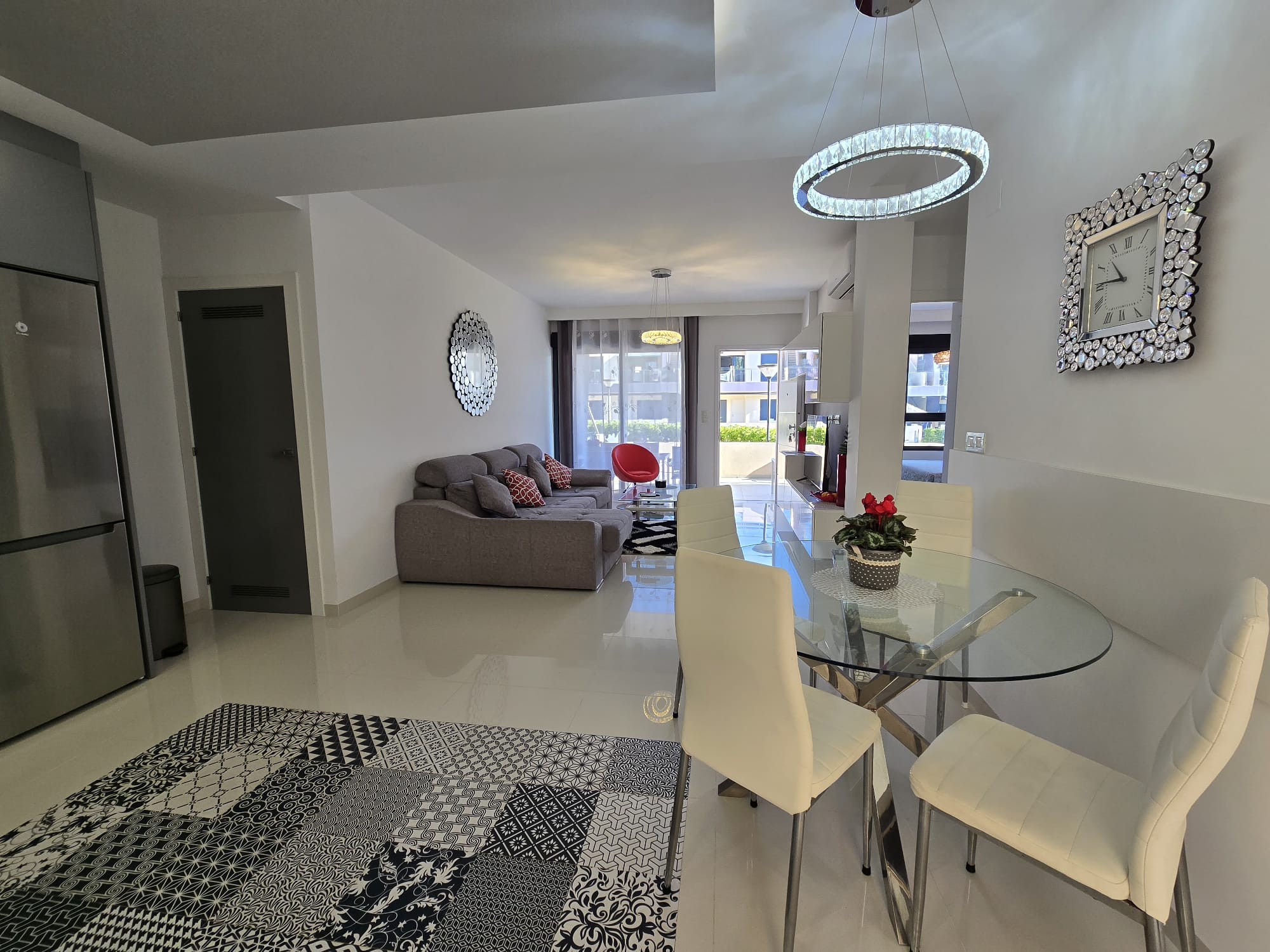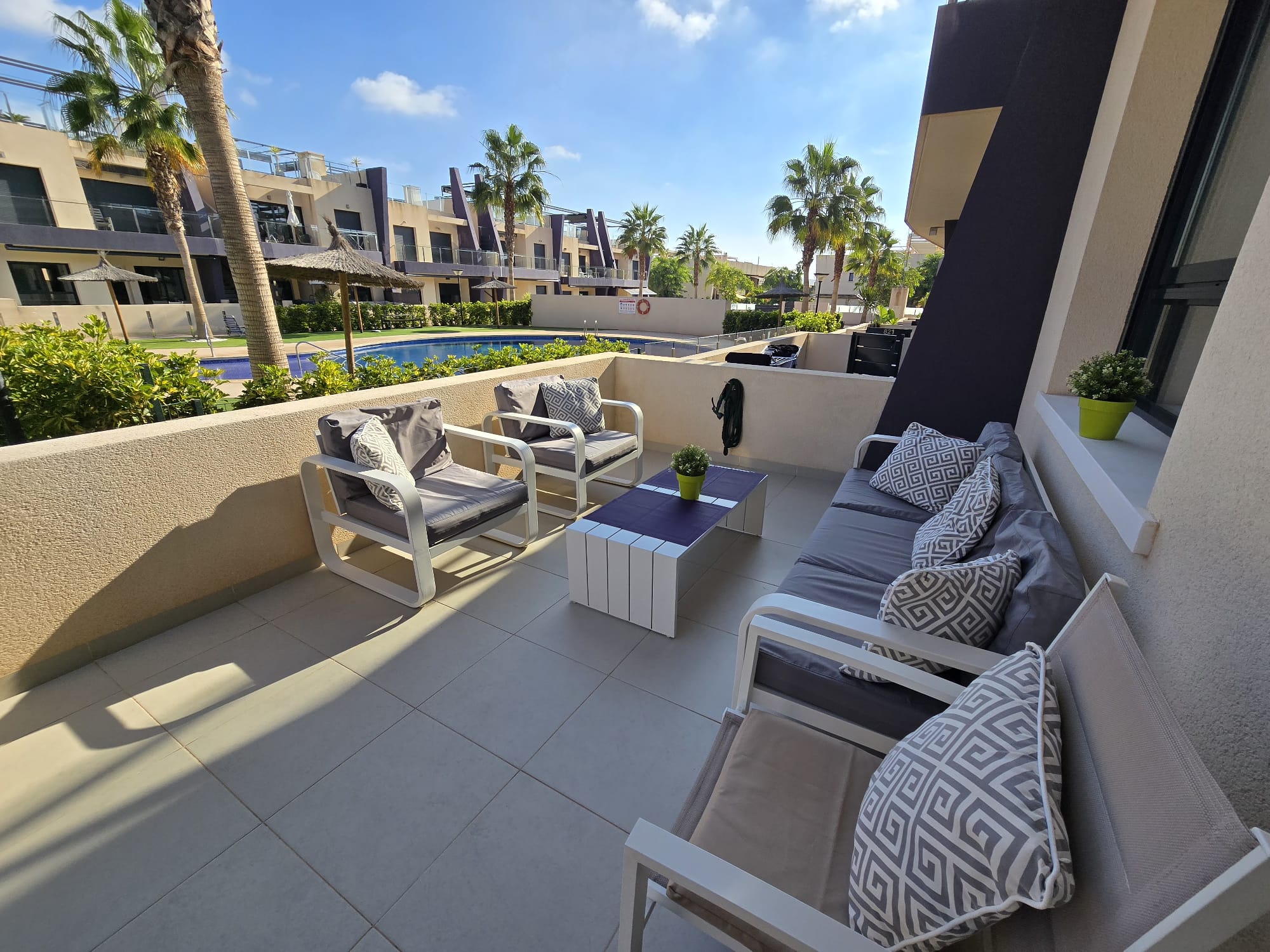 Este moderno apartamento se encuentra en excelentes condiciones, listo para entrar a vivir, ubicado en una urbanización cerrada y segura, construida en 2019. El salón-comedor es luminoso y espacioso, con acceso directo a la terraza que da a la piscina y a las zonas comunes de la comunidad. La terraza junto a la cocina ofrece espacio adicional, perfecto para comer al aire libre.