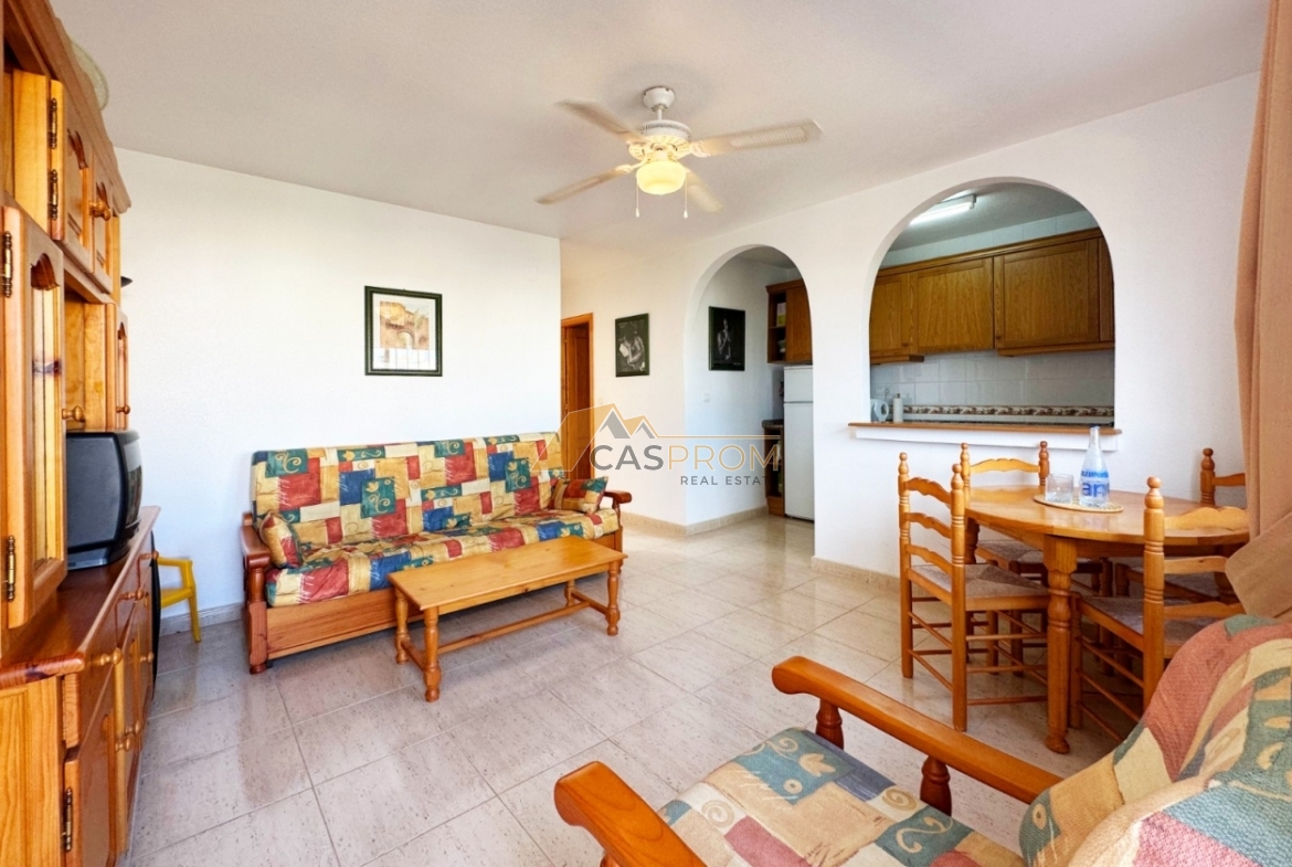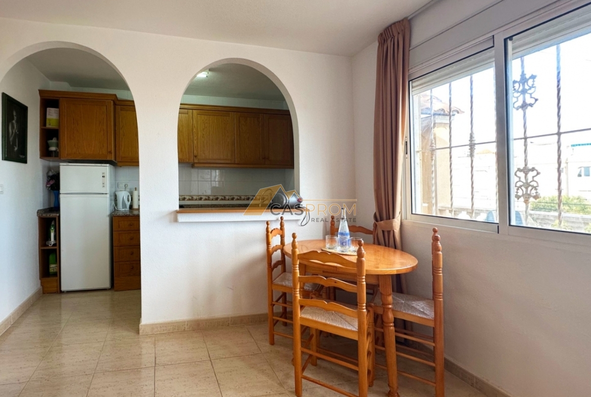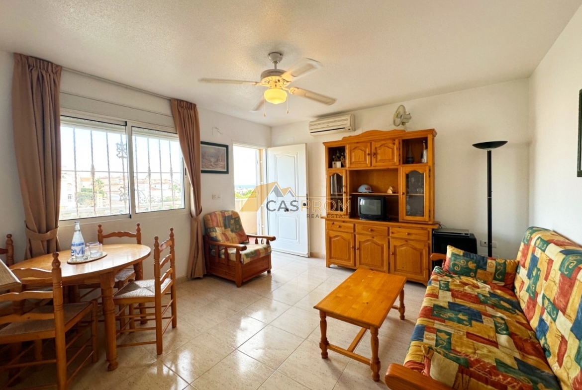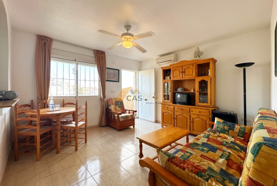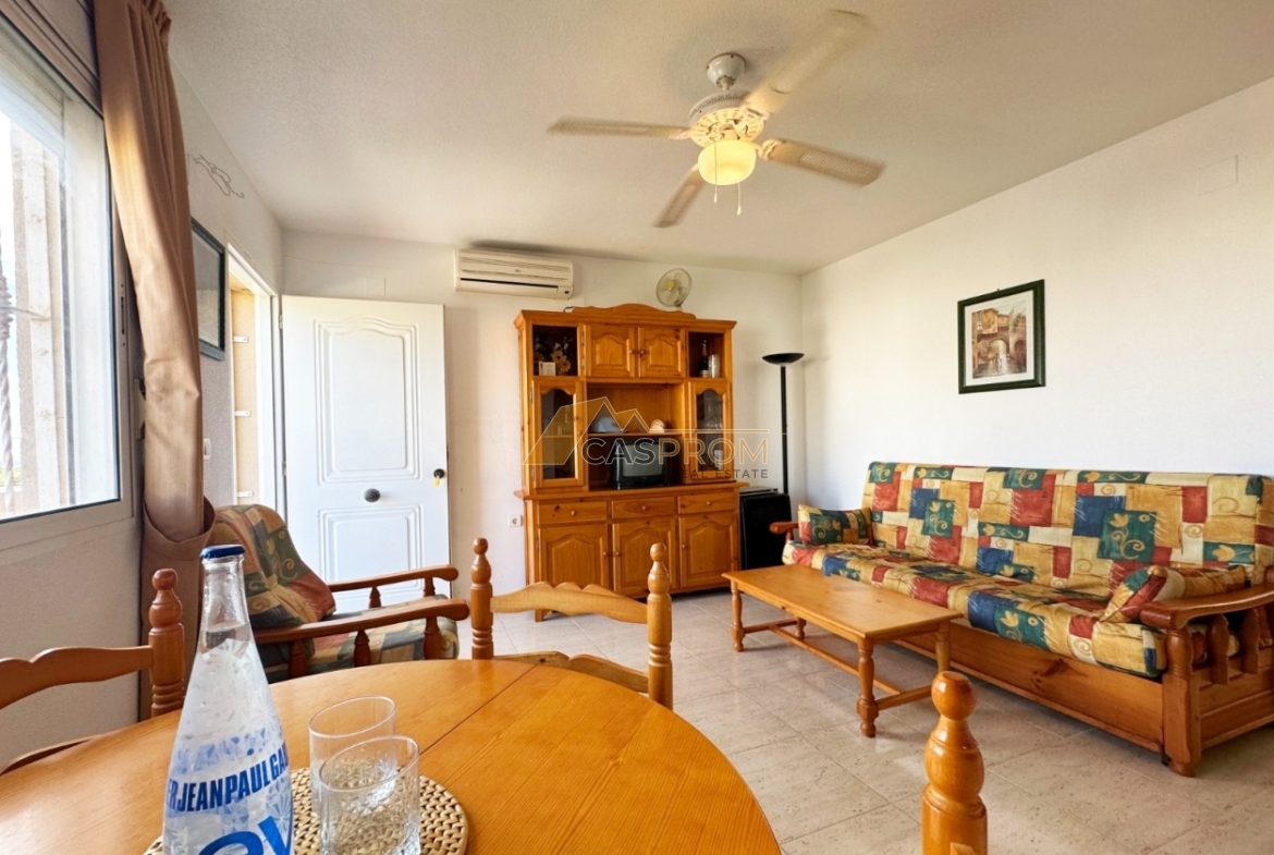 Discover this charming top-floor bungalow located in the Miramar Golf II complex in the sought-after area of El Galán/Villamartín. The 45 m² of living space is tastefully and efficiently designed, featuring two comfortable bedrooms, a stylish bathroom, an open American-style kitchen and a cozy living-dining room. The 8 m² solarium/terrace is ideal for enjoying the sunshine and beautiful views, including lovely sea panoramas. The property is in good condition, equipped with air conditioning, electric shutters, and is sold fully furnished. The gated community offers a communal swimming pool, making it an ideal home for permanent living or as a rental investment. Low community fees and the excellent location make this a fantastic opportunity.