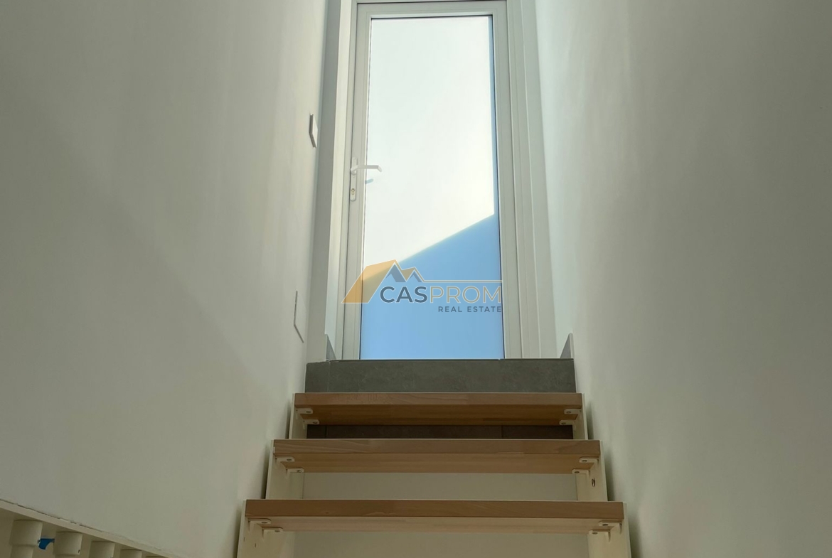 The kitchen is fully equipped with appliances, including an induction cooktop, oven, microwave, dishwasher, and refrigerator. Daily comfort is enhanced by a modern air conditioning and heating system based on an aerothermal heat pump, electric blinds in the bedrooms, a video intercom, and a pre-installed smart home management system.