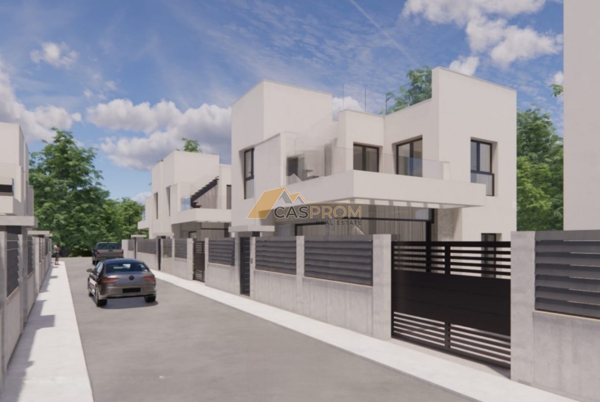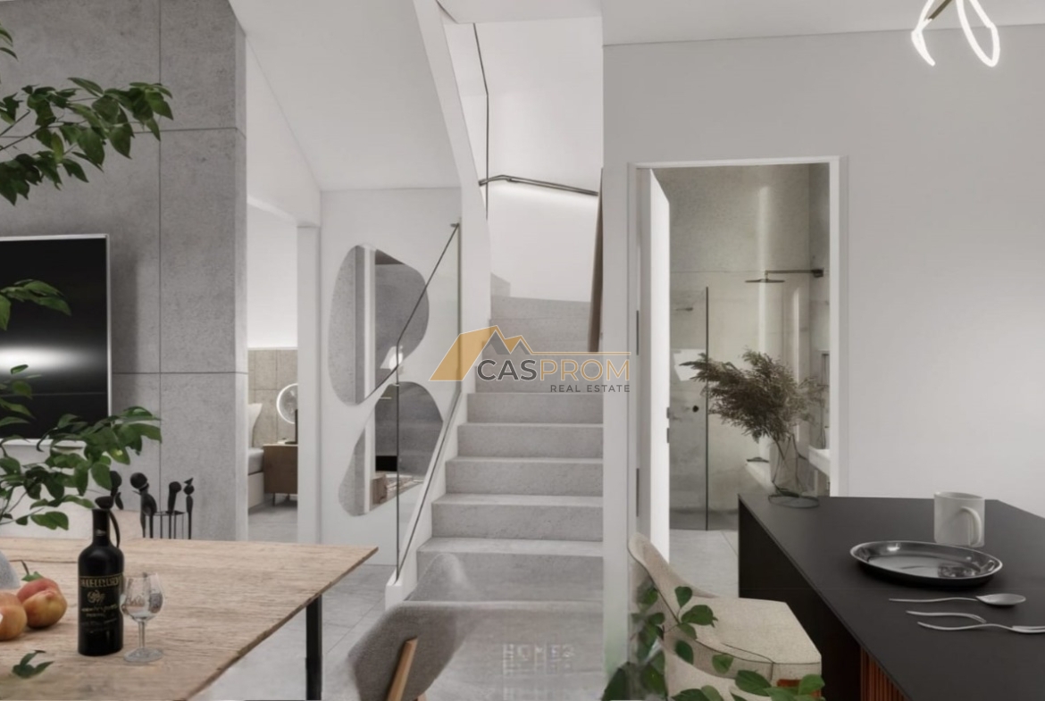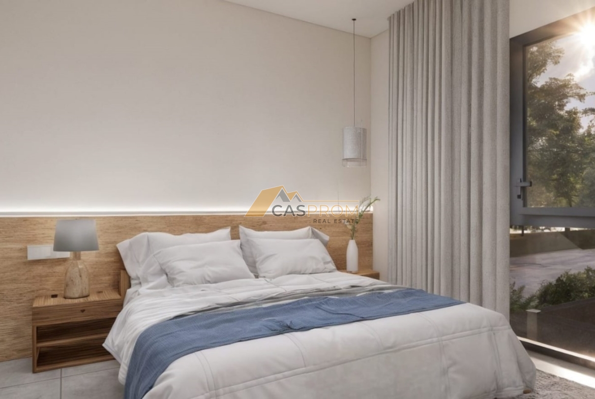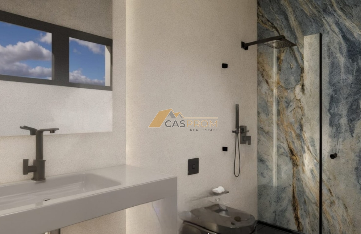 This modern villa is part of a prestigious development designed with comfort and a modern lifestyle in mind. High-standard finishes include a plaster and natural stone facade, aluminum windows with low-emissivity glass, electric shutters, and ceramic flooring throughout the interior and exterior.