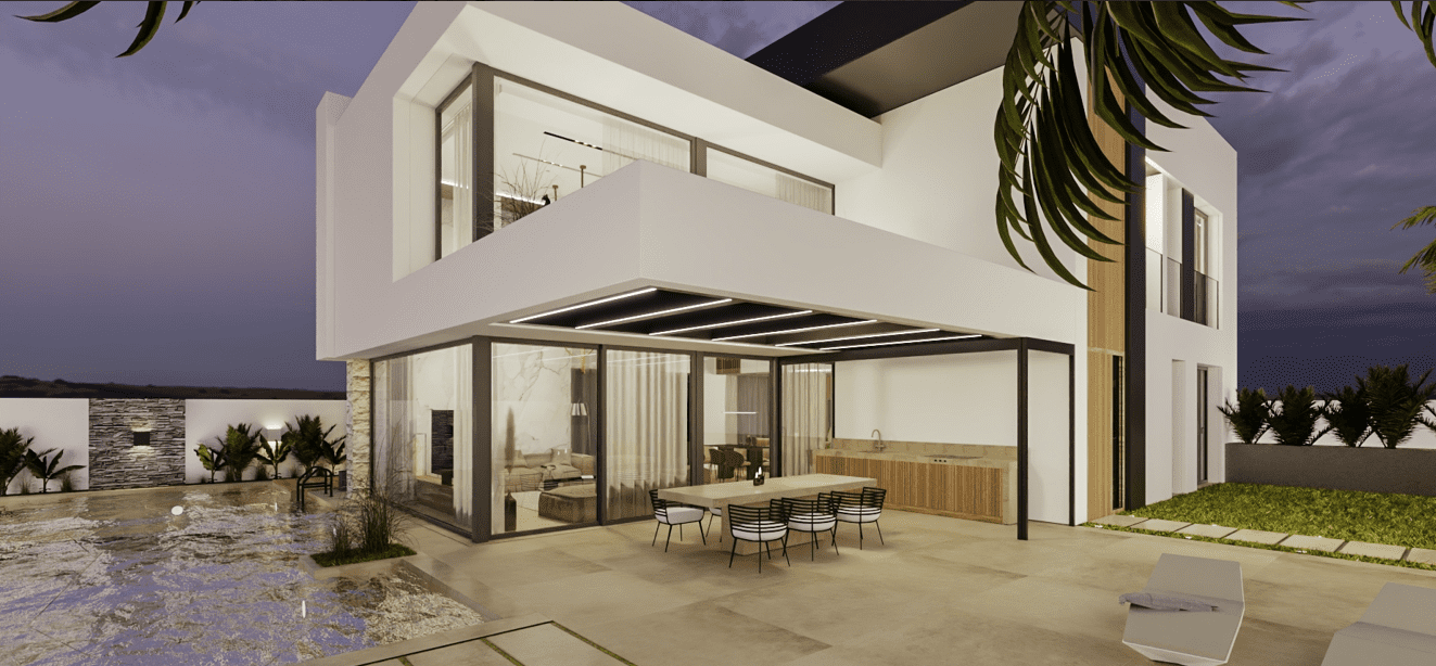 La parcela está vallada y dispone de piscina privada, jacuzzi, zona de relax con cocina exterior junto a la piscina y pérgola bioclimática retráctil automáticamente.
