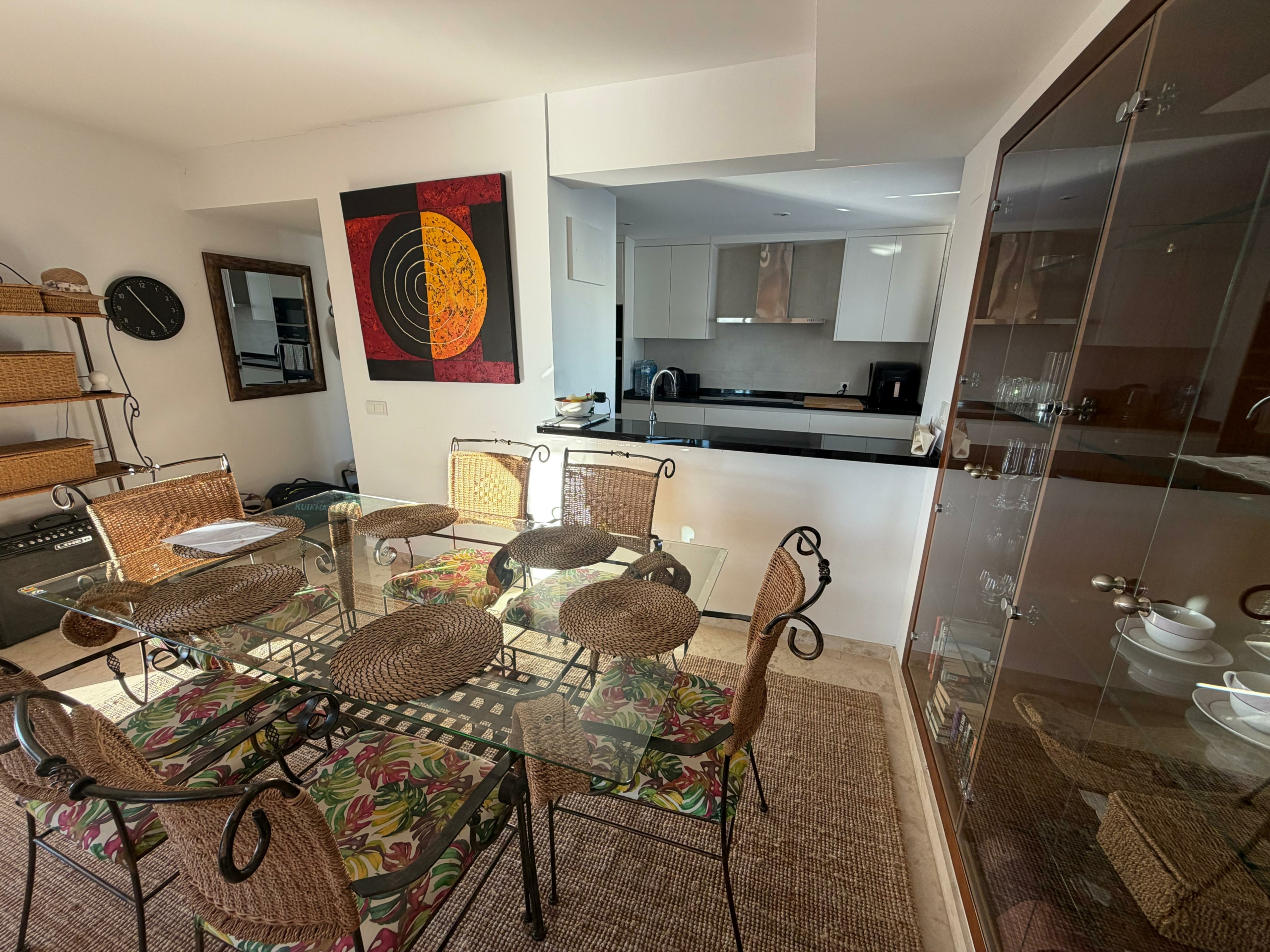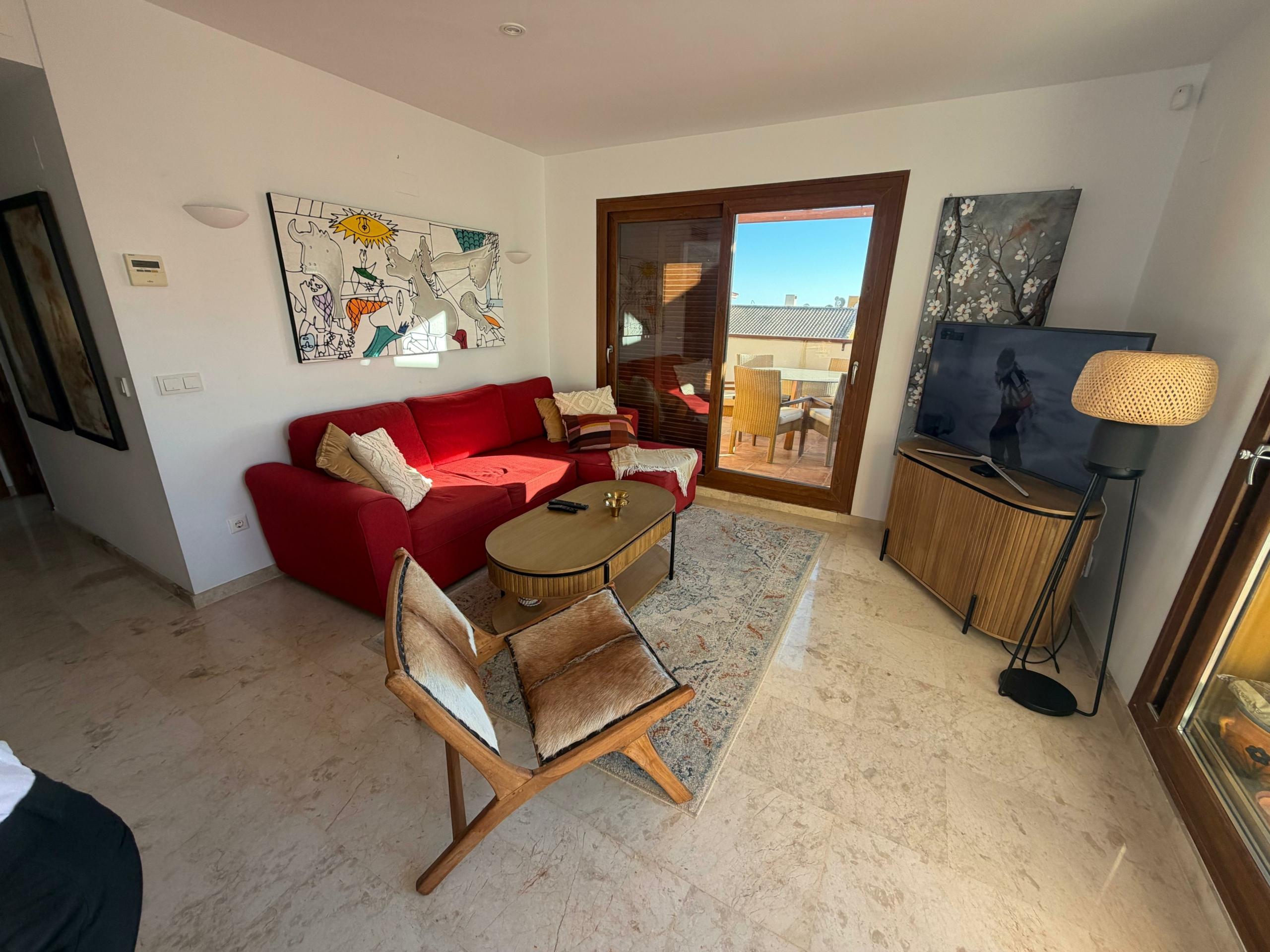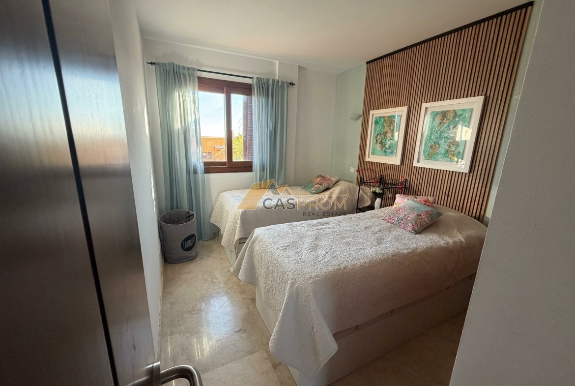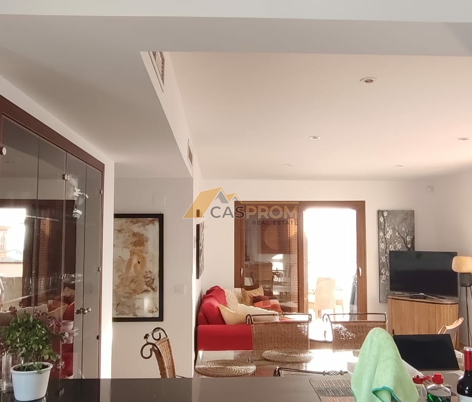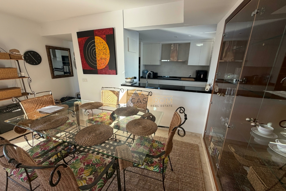 El apartamento cuenta con un amplio y luminoso salón con comedor y una moderna cocina americana. El salón da a una impresionante terraza de 65 m² con vistas a la piscina y a las zonas comunes. Es el lugar perfecto para relajarse, cenar al aire libre y disfrutar de más de 300 días de sol al año.
