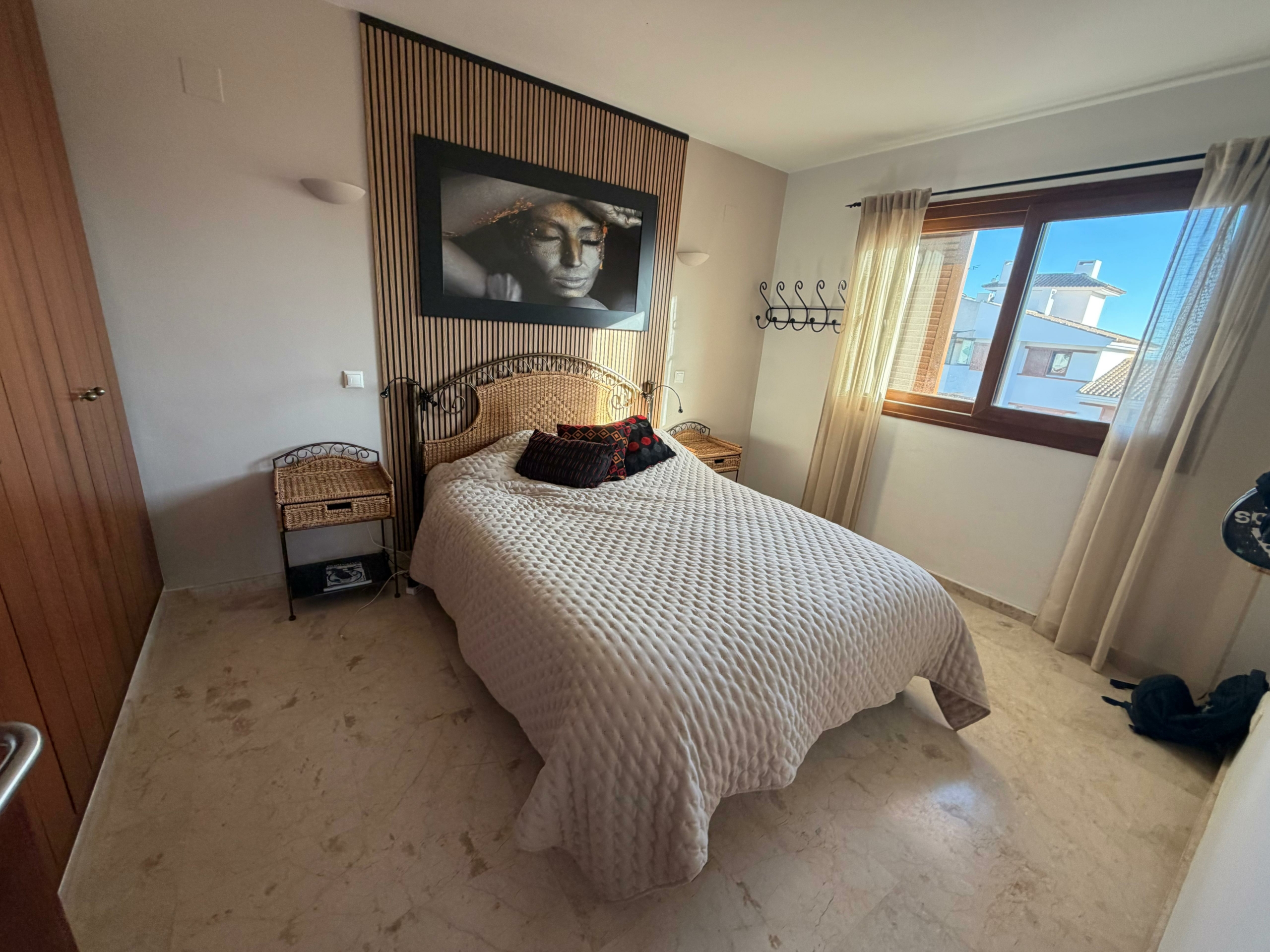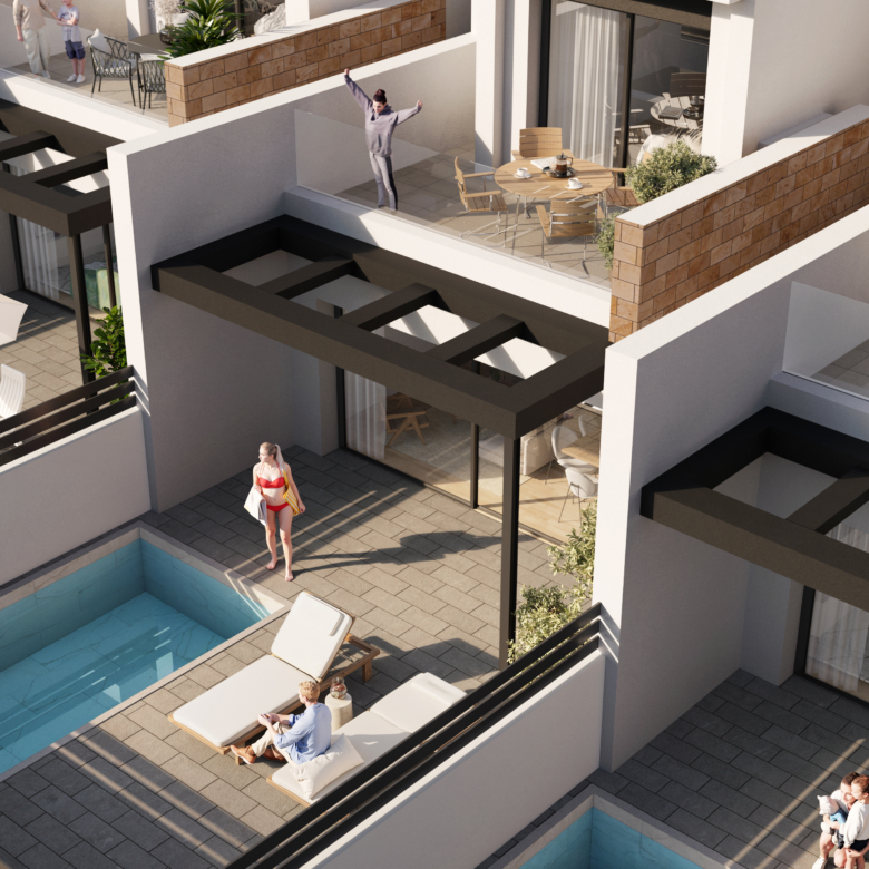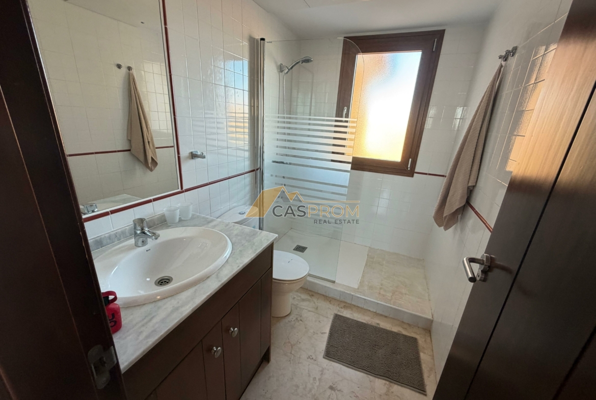The apartment features a bright, spacious living room with a dining area and a modern open-plan kitchen. The living area opens onto an impressive 65 m² terrace overlooking the pool and communal areas. It’s the perfect place to relax, dine al fresco, and enjoy over 300 days of sunshine a year.