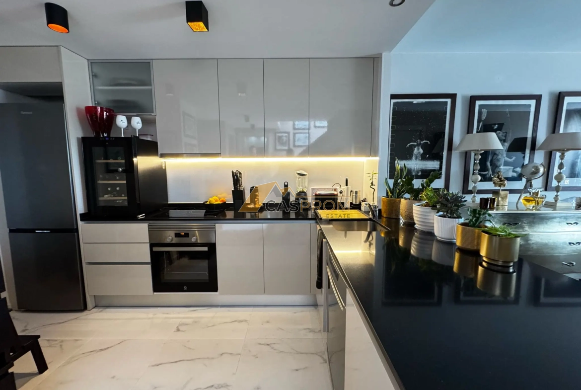 One of the property’s greatest advantages is the spacious balcony overlooking the sea and the complex’s green grounds, perfect for morning coffee or relaxing at sunset. The penthouse also boasts a private 40 m² solarium, perfect for sunbathing, meeting friends, or creating a private relaxation area. The apartment is sold unfurnished – furniture can be purchased for an additional fee.
