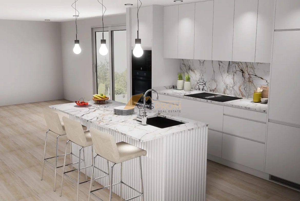 The ground floor features a spacious living room/dining room and a modern open-plan kitchen with direct access to the terraces and pool area. Extensive glazing ensures excellent interior lighting and a seamless connection between the interior space and the garden. The first floor features a night area with three comfortable bedrooms and two modern bathrooms. An additional space is provided by a private 61 m² solarium, perfect for sunbathing, relaxing, or creating a chill-out zone with panoramic views.