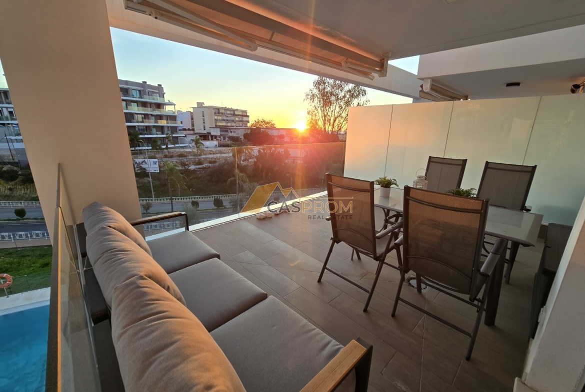 El apartamento se encuentra en una tranquila urbanización con una luminosa arquitectura mediterránea. Los residentes tienen acceso a una piscina comunitaria, rodeada de cuidadas zonas verdes y recreativas, ideal para el descanso y la relajación. Las zonas comunes están diseñadas con estética y se mantienen regularmente, y la urbanización ofrece un ambiente tranquilo y privado, a la vez que se mantiene cerca de los servicios de la ciudad. Los edificios disponen de ascensores.