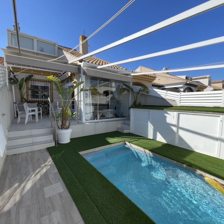CASPROM PRESENTA UN MODERNO DÚPLEX CON PISCINA PRIVADA Y SOLÁRIUM PANORÁMICO, A 750 M DEL MAR EN SANTIAGO DE LA RIBERA Esta propiedad cuenta con una superficie útil de 121,20 m², con una terraza de 28,60 m² y un solárium de 48,30 m². Se distribuye en dos plantas comunicadas por escalera interior. EL DUPLEX OFRECE: • 3 dormitorios • 3 baños • Terraza • Solárium • Cocina americana con isla • Salón Este elegante dúplex