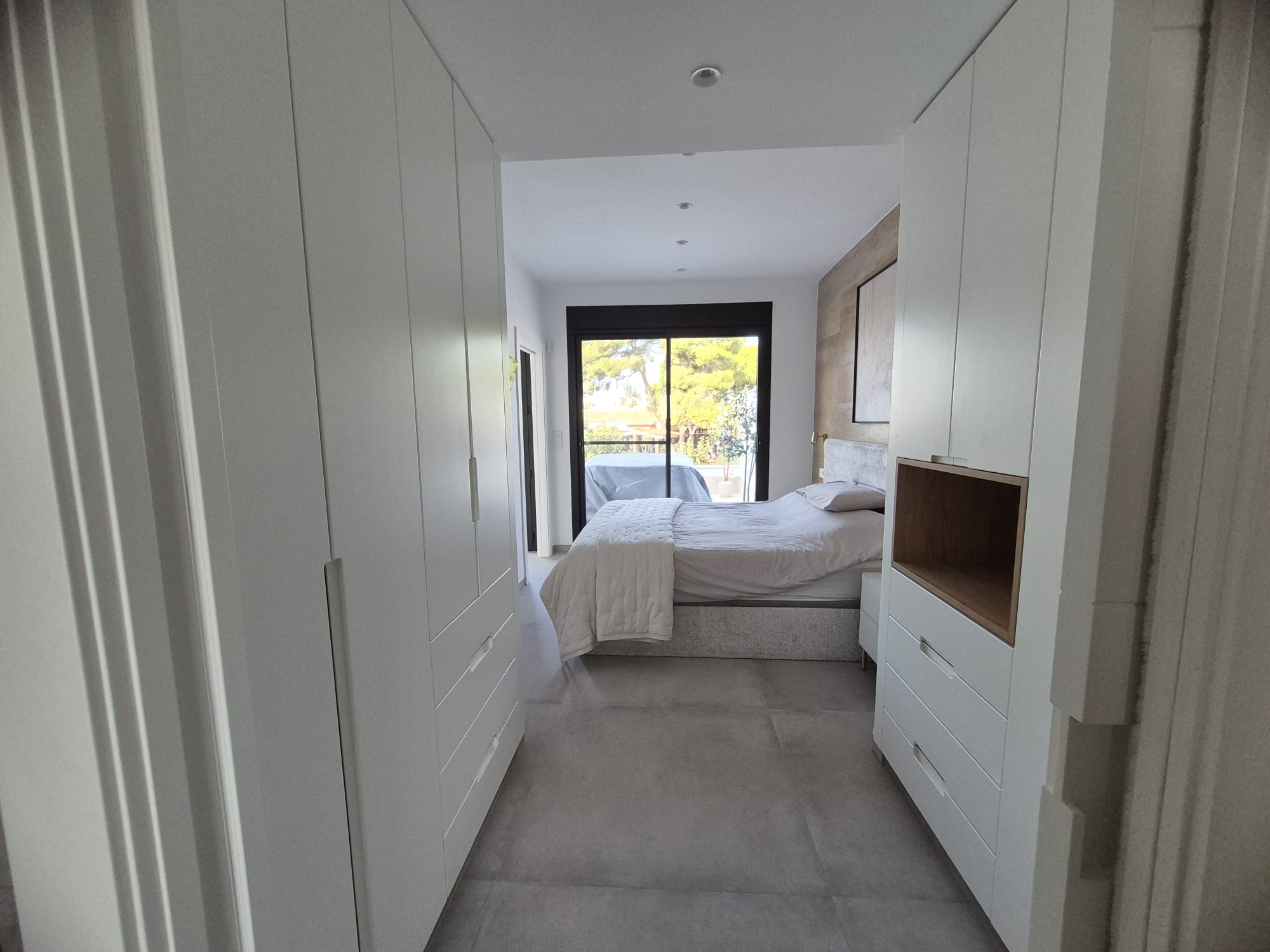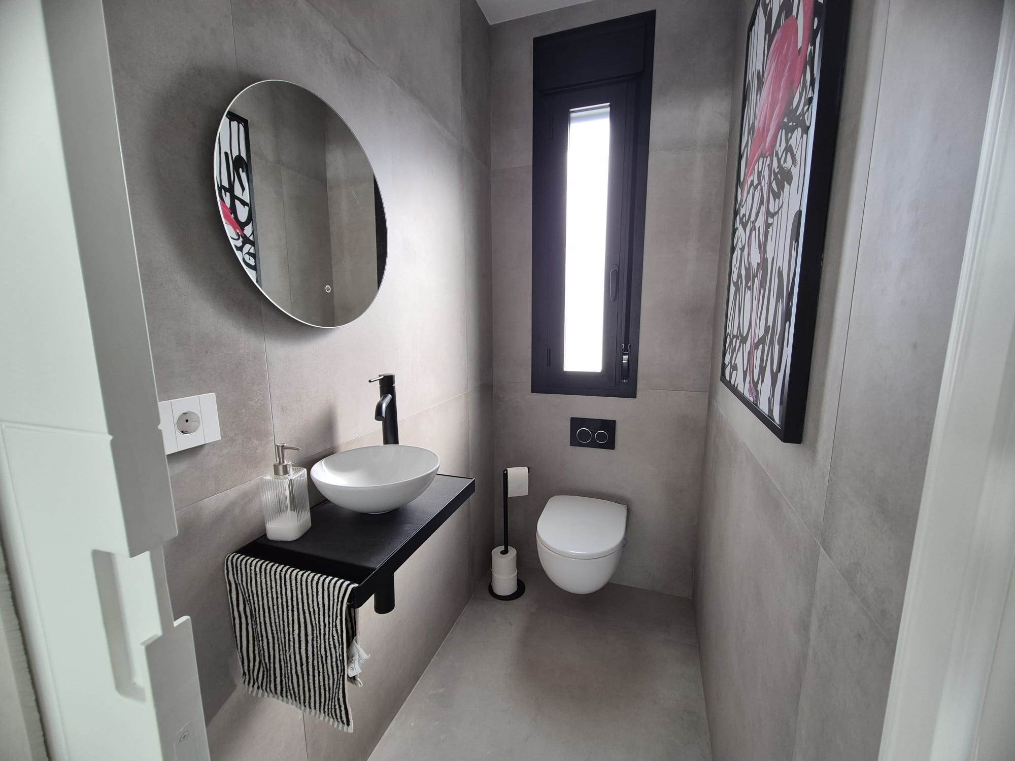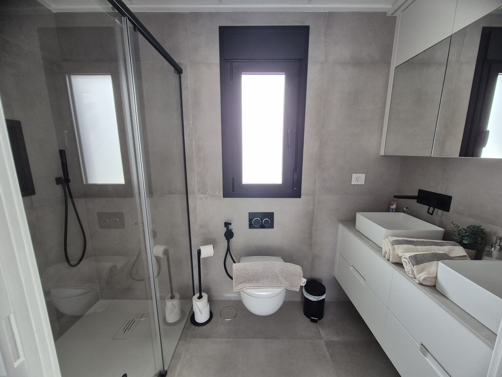 La propiedad está equipada con aire acondicionado Airzone, sistema de calentamiento de agua por aerotermia, suelo radiante en los tres baños, mosquiteras en todas las ventanas (automáticas en el salón), dos toldos automáticos, iluminación LED interior y exterior, altavoces exteriores y garaje cerrado. La cocina principal está totalmente equipada con electrodomésticos y una isla de cocina, mientras que los baños cuentan con modernos sanitarios suspendidos.