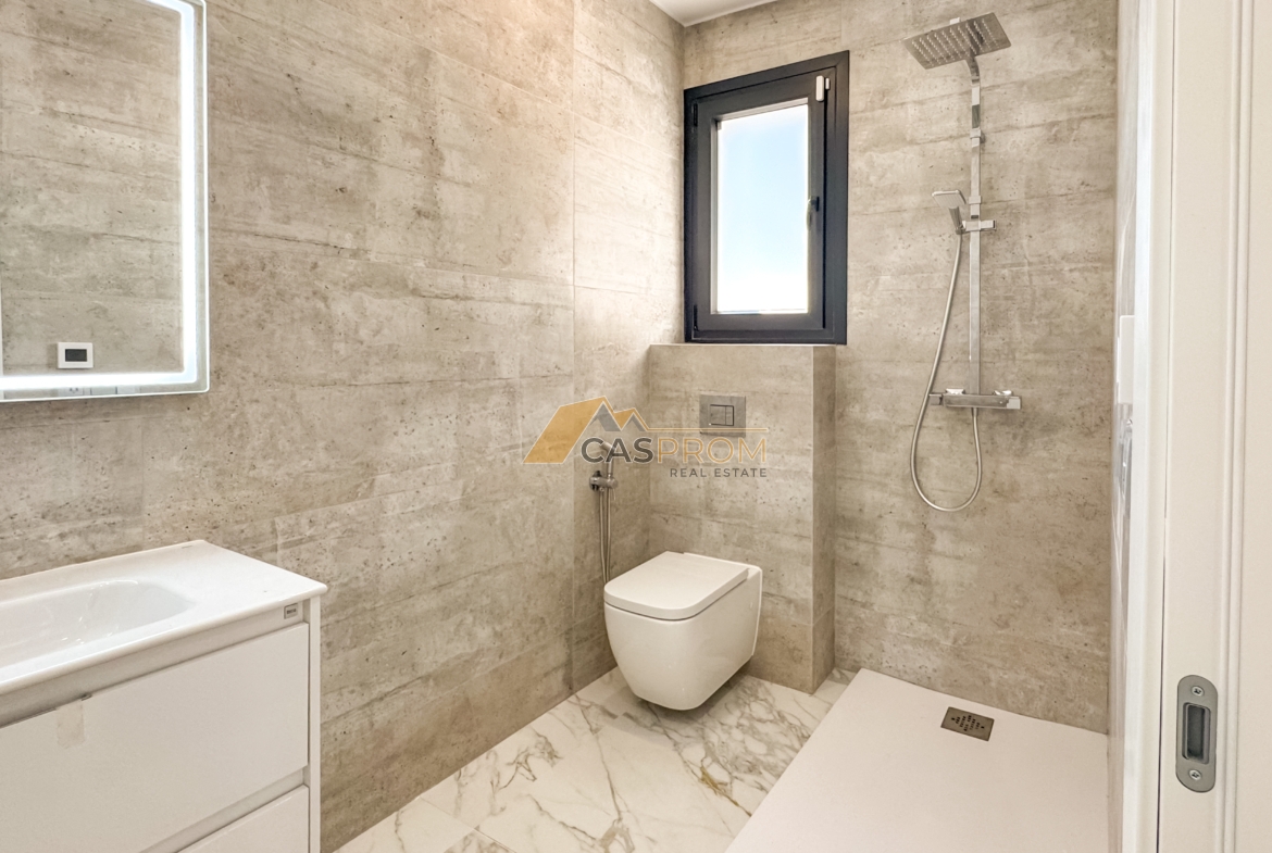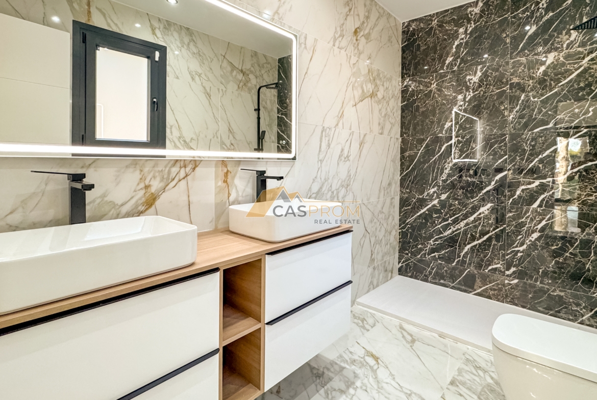 Outside, there’s a spacious garden and a private 4 x 10 m swimming pool with heating and a seawater system. The interior is equipped with high-quality finishing materials: underfloor heating and a heat pump in the bathrooms, central air conditioning with the Air Zone system, security doors, and an alarm with police notification.