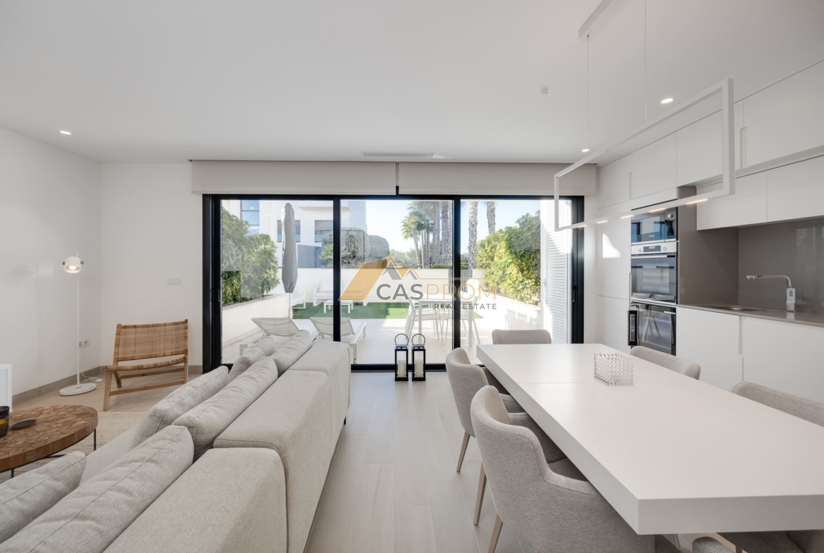 The apartment is fully equipped and ready to move into. It is situated in a highly prestigious area surrounded by green spaces, shops, and golf courses. The apartment includes a private parking space, storage room, central air conditioning, garden, and terrace. The communal areas offer a large swimming pool and extensive green spaces.