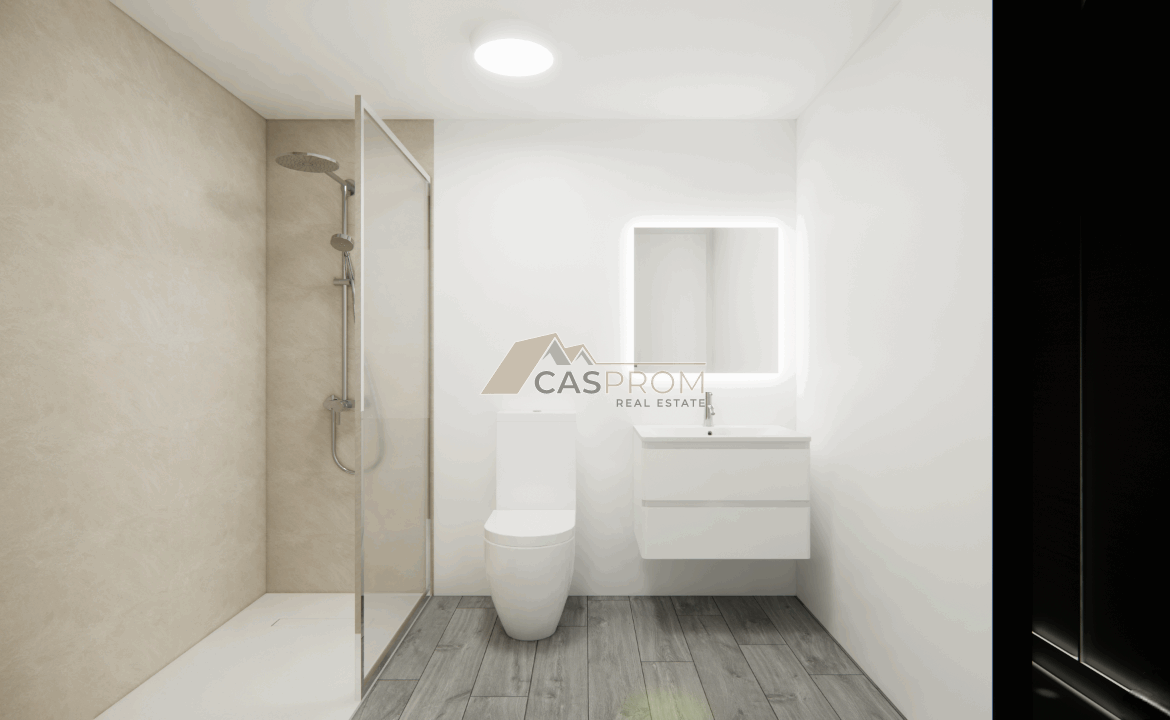 The kitchen is equipped with upper and lower cabinets, countertops, a ceramic hob, oven, extractor hood, and sink with a mixer tap. Bathrooms are finished with great attention to detail and include a vanity unit with integrated sink, shower with tempered glass screen, chrome fittings, rainfall shower, and mirror.