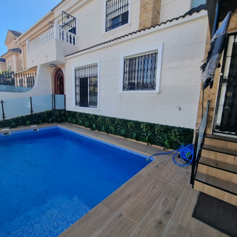 La propiedad cuenta con una piscina infinita privada de agua salada de 42 m², revestida con piedra balinesa e iluminada con LED. Está rodeada por un jardín mediterráneo con palmeras, cítricos, strelitzias y sistema de riego automático.