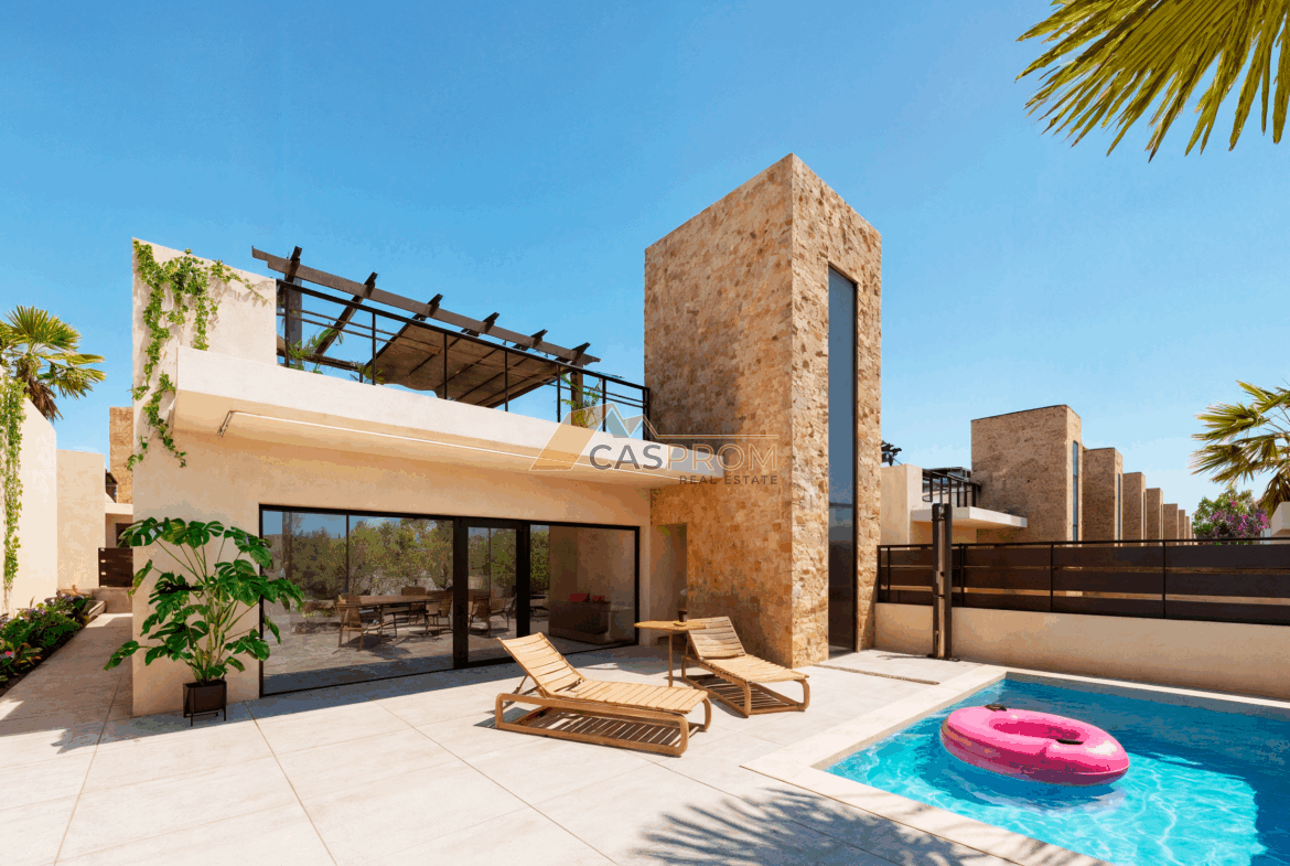 Esta propiedad, con una superficie útil de 94 m², se ubica en una parcela de 200 m² y cuenta con un solárium de 83 m². La villa también incluye una piscina privada de 2,5 m x 4,5 m, equipada con sistema de cloración salina e iluminación nocturna LED, que crea un ambiente único por las noches.